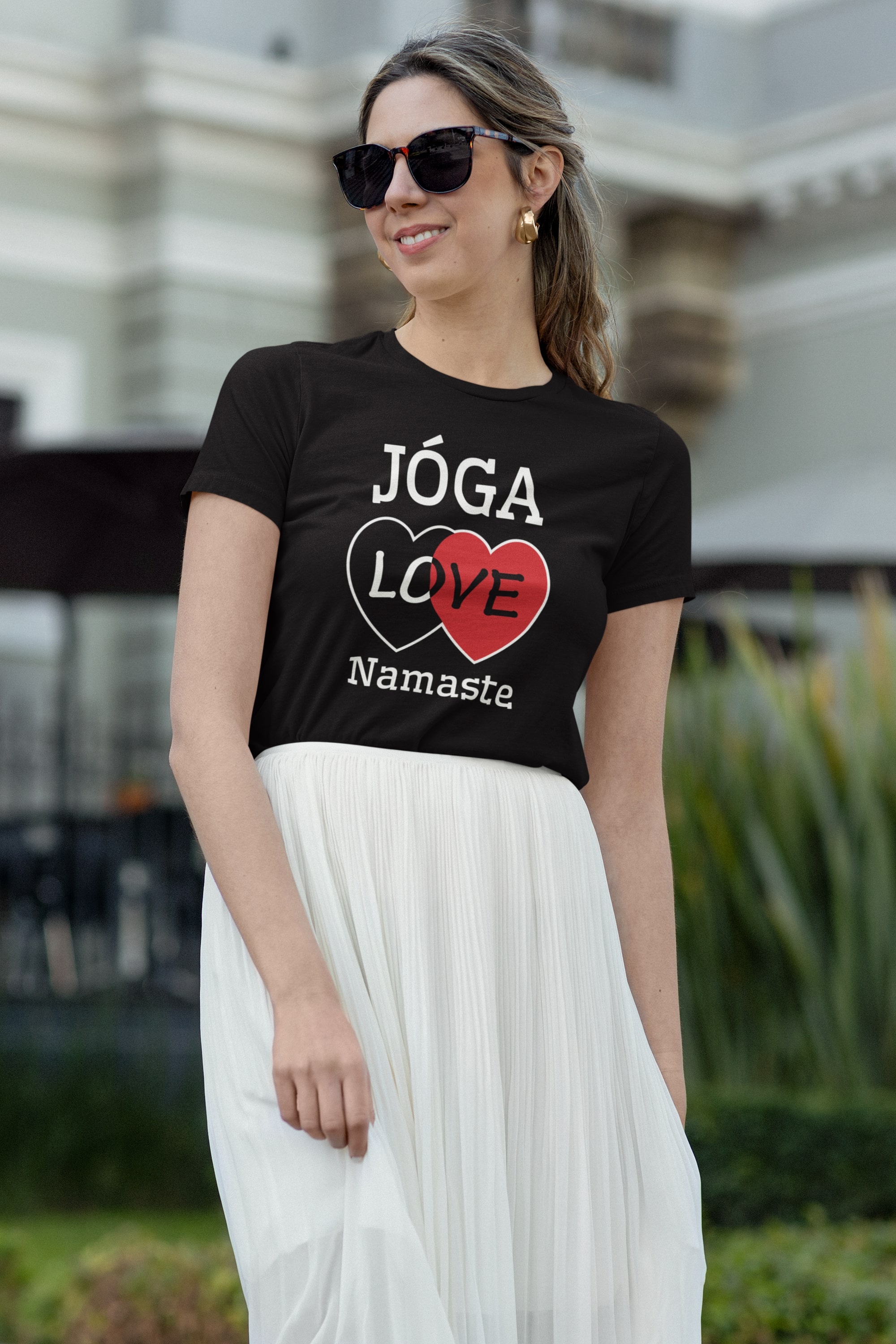 Dámské tričko s potiskem na jógu obsahuje logo srdce a nápisy Jóga, love, namaste. Bavlněné tričko jóga v černé barvě.